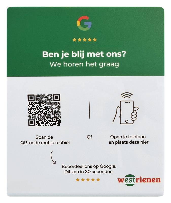 Zij houden hun telefoon eenvoudig tegen het bord. Door de NFC-chip opent er direct een pagina om een review te plaatsen in Google. Het unieke aan ons bord is dat het ook een QR-code heeft. Jouw klant kan deze ook scannen met de mobiel om de pagina te openen.