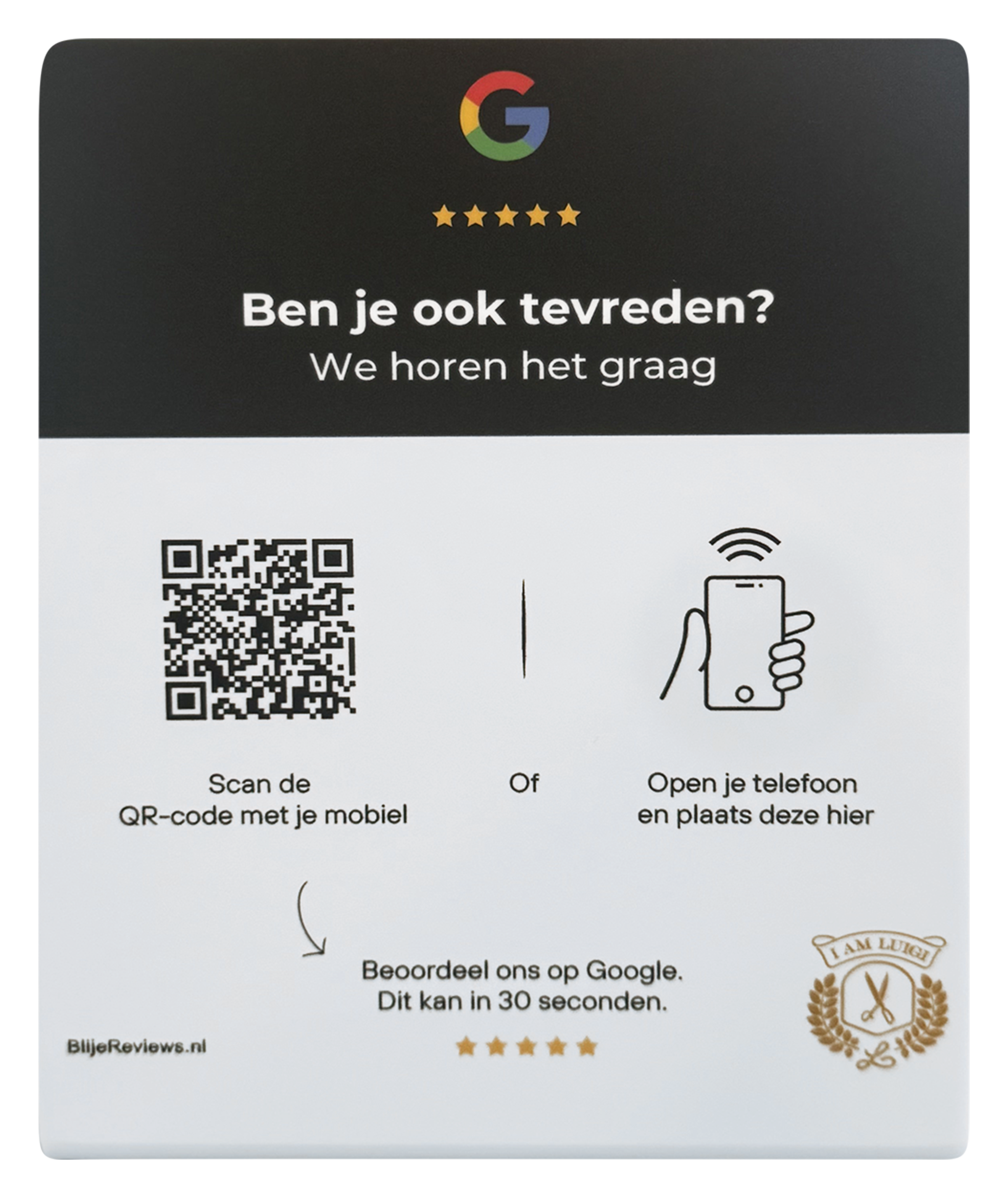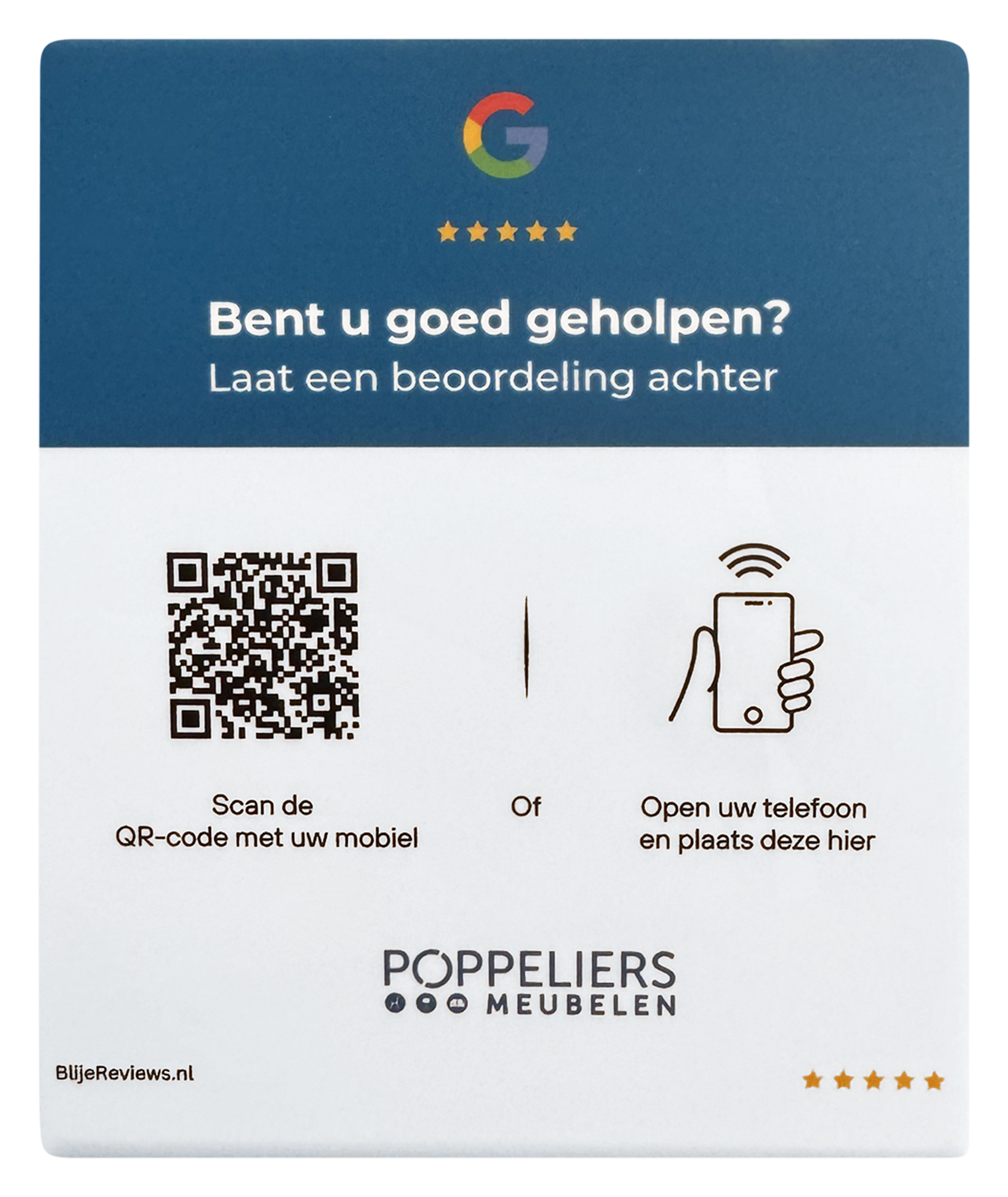 Reviews zijn tegenwoordig onmisbaar in Google. Velen kijken eerst online naar ervaringen van anderen. Dit doen ze voor hun eerste aankoop, reservering of bezoek. Met deze display garanderen we dat je meer 5-sterren reviews verzamelt. Je kunt het direct neerzetten in je zaak. Wij stellen het namelijk voor je in, zodat je er geen omkijken naar hebt.